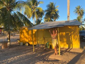 Geralmente não possuem forro no teto, só as telhas do telhado mesmo e divisões das portas com cortinas, assim são as casas de pescador da região. E essa é a nossa grande inspiração no desenvolvimento de tudo por aqui na nossa vilinha Casa de Corda.